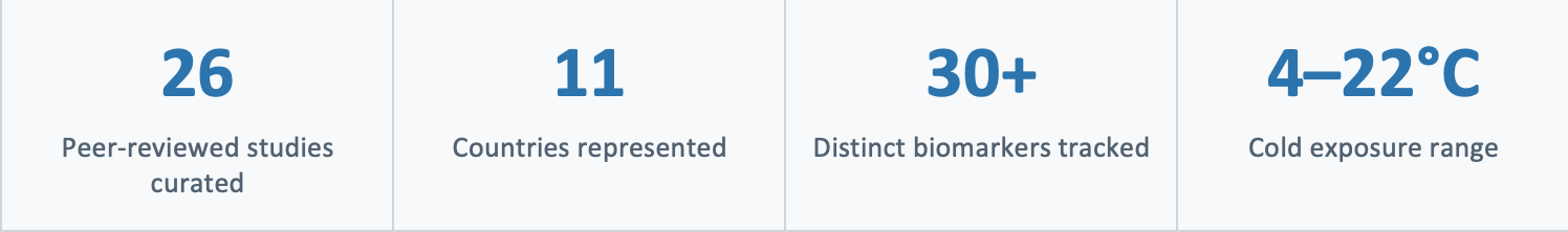 Our work does not start from scratch. Before we wrote our open science protocol, we curated and normalized 26 peer-reviewed studies on cold exposure and human metabolism spanning 2002 to 2022. The result is publicly available through the Cold Therapy Evidence Explorer. It is the analytical substrate on which every downstream decision in the study rests: the outcome measures, the biomarker shortlist, the AI model design.