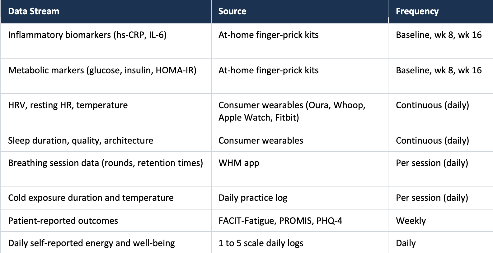 Our feasibility pilot is deliberately small: 15 to 20 participants in our treatment group, 16 weeks, fully remote. The architecture of data it will generate is not. As far as we know, this is the first cancer cohort that will produce all of the following streams at once, longitudinally, under a standardized WHM protocol: